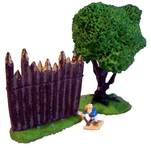 Methusalix beim Spaziergang, ein Baum und eine Palisade