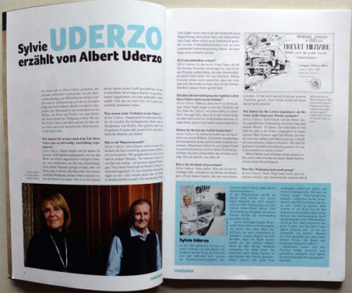 - Ausgabe 74/75 (Mai 2004): Der 1 1/3 seitige Artikel "Albert Uderzo - Der Witz aus dem Stift" von Herbert Heinzelmann beleuchtet anlässlich der Verleihung des Max und Moritz-Preises an Albert Uderzo für sein Lebenswerk dessen Wirken. Zudem kommt der Preisträger selbst in einem 2/3-seitigen mit "Ich bin doch nicht der Papst" überschriebenen Interview zu Wort.