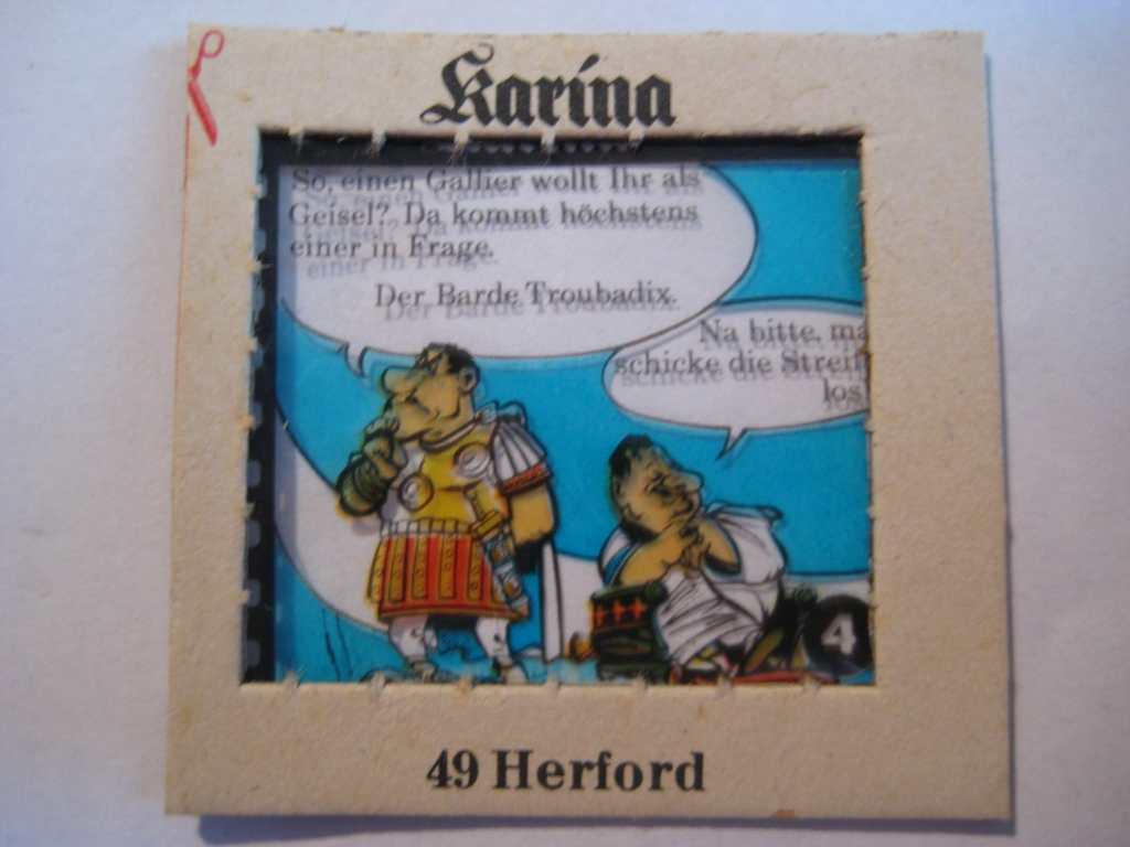 ich habe heute eine Reihe von Dias bekommen, zu denen ich keinerlei Informationen finden kann. Scheinen eine Webegabe von Karina Schokolade aus 49 Herford zu sein. Die Serie geht auf jeden Fall bis Nummer 15, Nummer 1 und 2 fehlen bei mir, anbei mal ein paar Bilder.