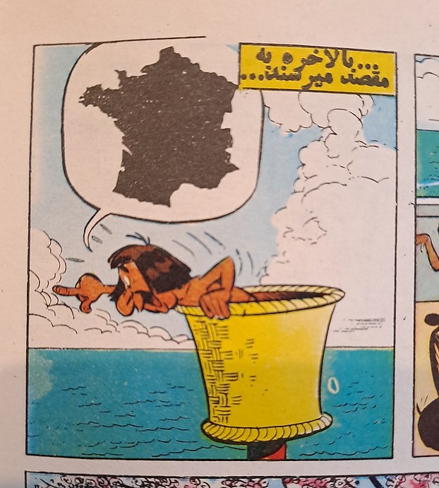 Hier noch zweimal die Gallien-Hieroglyphe, richtigrum, aus einer ägyptischen und eben der genannten iranischen Ausgabe. Die Chance, es richtig hinzukriegen, liegt bei den Herausgebern von Asterix in Sprachen mit Rechts-nach-Links-Schriften über den Daumen gepeilt bei 50%