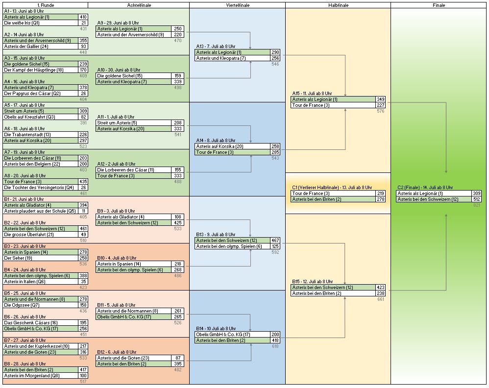 Die Zahlen in Klammern hinter dem Albumnamen im Turnierplan entsprechen der Setzliste der Asterix-Abenteuer und ergaben sich aus der Rangliste der Asterix-Hefte in der Comedix-Bibliothek (Stand Februar 2024).