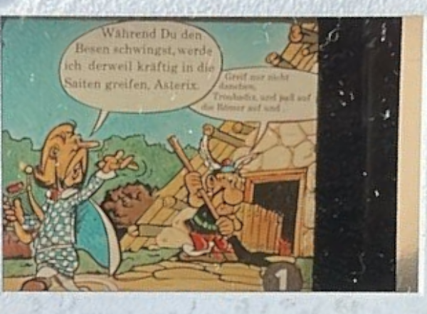 ich habe drei Dias unbekannter Herkunft ohne Textaufdruck bekommen. Das hier abgebildete ist offensichtlich ein sehr frühes Bild aus Asterix als Gladiator. Allerdings entspricht der Text keiner mir bekannten Albenausgabe. Kann es sein, dass das vielleicht ein Text aus MV Comix ist (Ausgabe 31 - 38/1968), noch vor der Verpflichtung von Gudrun Penndorf? Oder gar ein Text, der in Lupo Modern (Ausgabe 16 bis 26/1965) verwendet wurde? Kann das jemand nachsehen?