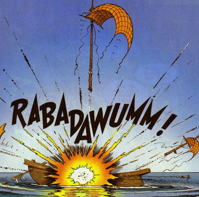 Ein Knall enthält viele Frequenzen, die so miteinander wechselwirken, dass der zeitliche Ablauf des Knalls kurz ist. Wenn sich der Schall durch die Luft ausbreitet, dann werden hohe Frequenzen stärker gedämpft als tiefe Frequenzen, desto dumpfer wird der Knall. Um das Geräusch zusätzlich noch länger zu machen, braucht es Reflexionen an Oberflächen bzw. Beugung, all das wird einfacher wenn man weiter entfernt ist. "Rabadaboum" deutet also an, dass der Zeichner ein gutes Stück vom Schiff entfernt ist.
