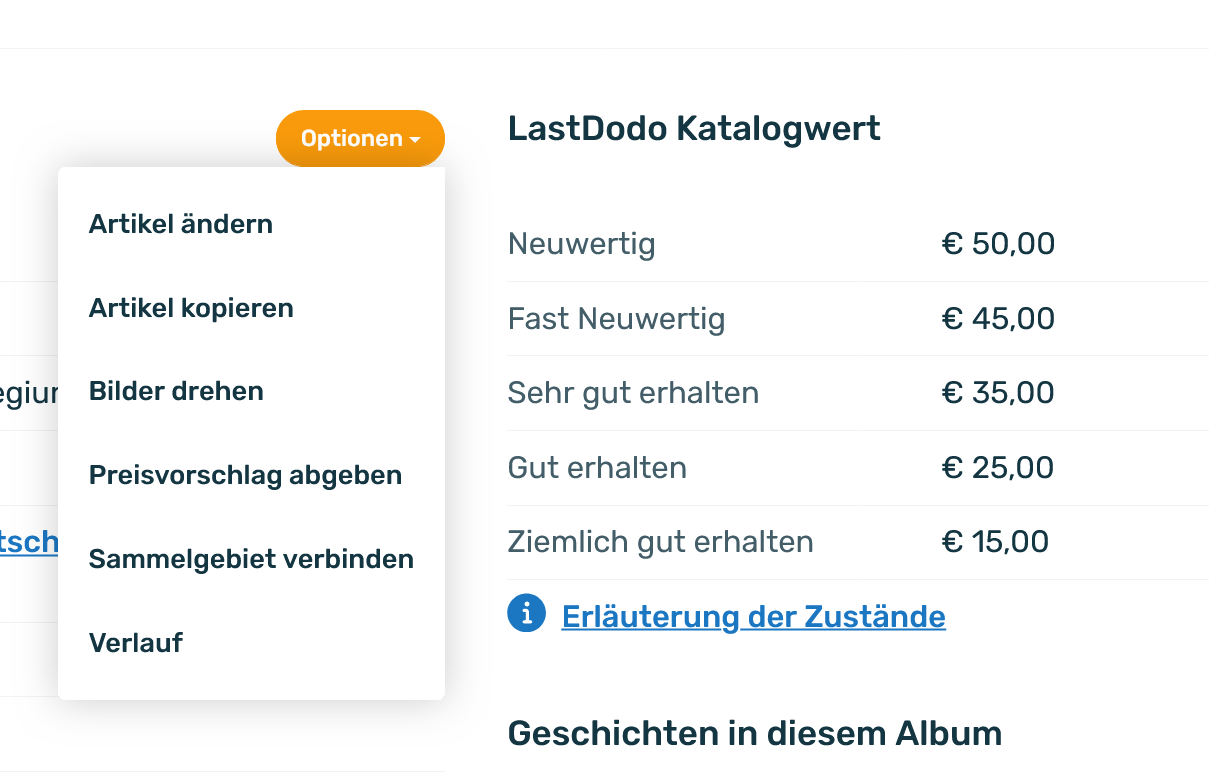Man hat als User links daneben die Möglichkeit unter 'Optionen' einen Preisvorschlag für die verschiedenen Zustände abzugeben und weiter oben steht, dass aktuell wohl 15 Nutzer nach diesem Band suchen. Eventuell beruht dieser "Katalogpreis" also auf Preisvorschlägen dieser 15 User.