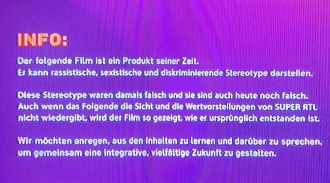 wenn dieser Hinweis immer passte, würde das aber bedeuten, dass jegliche Inhalte von ausgestrahlten Filmen die Wertvorstellungen von SuperRTL nicht wiedergeben würden.