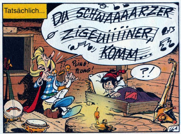Troubadix singt einen alten Schlager von Vico Torriani, und wenn mich meine Erinnerung an die Zeit, als das Lied gelegentlich - sogar öffentlich - zu hören war, passt es auch musikalisch so gut zu der Reaktion von Pepe, wie man es eben von einem Schlager erwarten darf. Und von Troubadix ist man ja gewohnt, dass er keine Rücksicht auf seine Zuhörer nimmt, wenn er singt.