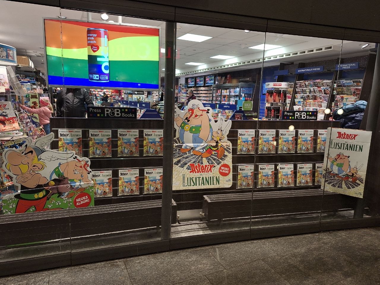 Die Kioske, die ohnehin auf meinem Arbeitsweg liegen, verkaufen praktisch überhaupt keine Druckwaren; insbesondere also auch keine Comics. Meine Softcover-Ausgabe habe ich mir daher morgens um kurz nach 8 Uhr im Supermarkt um die Ecke geholt. Buchhandlungen machten erst um 9:30 Uhr auf. Die kleinere Filiale einer großen Kette hat die Bände zwar geliefert bekommen, aber noch nicht ausgepackt. Ein großer Karton mit der Aufschrift "Asterix (23.10.)" stand noch ungeöffnet im Verkaufsraum. Die nur weniger Meter entfernte große Filiale derselben Kette hatte sich deutlich besser vorbereitet: Ein großer Tisch mit gleich mehreren Stapeln der Hardcover-Ausgabe, dazu quasi alles, was das Asterix-Sortiment sonst noch hergab (weitere Comic-Bände, die Omnibus-Ausgabe, Filmbücher, natürlich auch das Asterix-Quiz, Playmobil, ...). Und zu meiner Überraschung an der Kasse auch noch ein riesiger Stapel Softcover-Ausgaben.