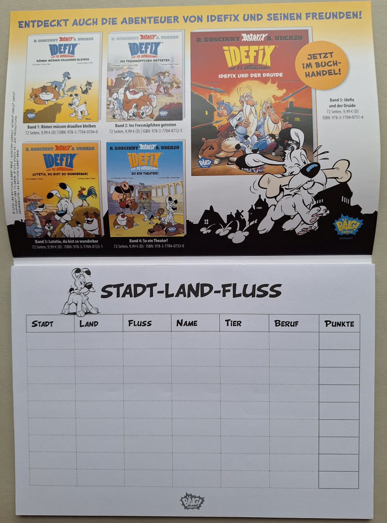 Wie man unschwer erkennen kann, ist eine der Beigaben ein Spielblock "Idefix und die Ungeugsamen - Stadt-Land-Fluss" aus der Edition Egmont Bäng, in der auch die Idefix-Bücher erscheinen. Der Block hat das DIN A5-Format und ist knapp 0,5 cm dick. So sehen Cover und Innengestaltung aus: